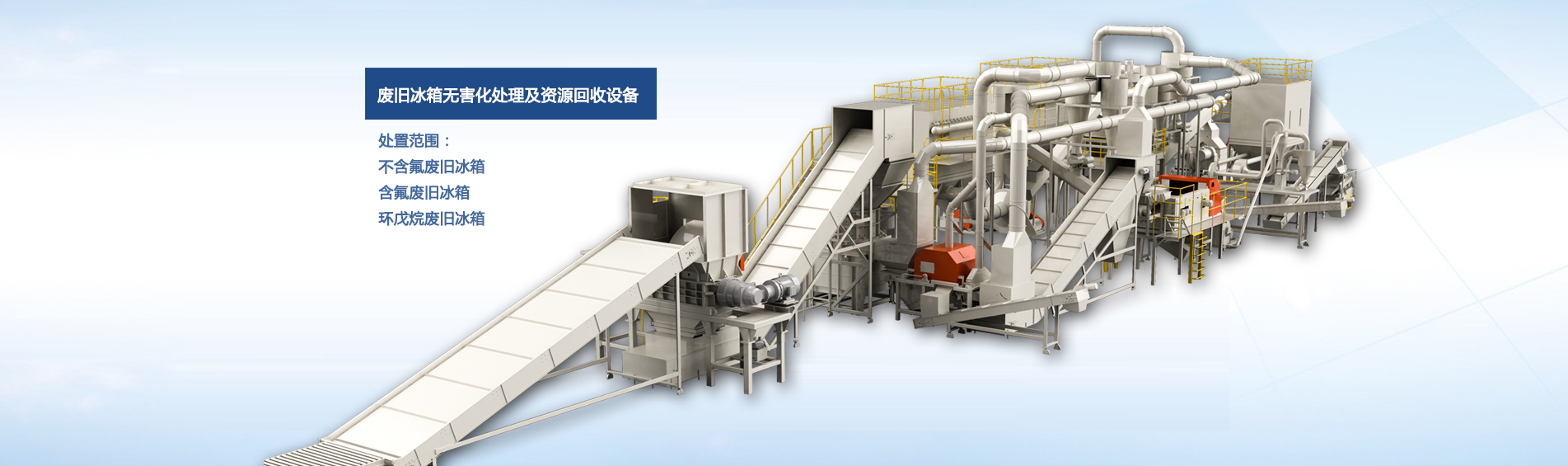 公司自主研發的廢舊冰箱無害化處理及資源回收技術及設備, 獨具 “雙軸撕碎機+立式破碎機+大風量稀釋環戊烷氣體”的專利組合設計, 主要用于對廢舊冰箱中的各種原材料進行分離、 回收和利用, 具有自主知識產權, 經國家工業和信息化部科技成果鑒定為 “填補國內空白, 達到國際先進水平” 。